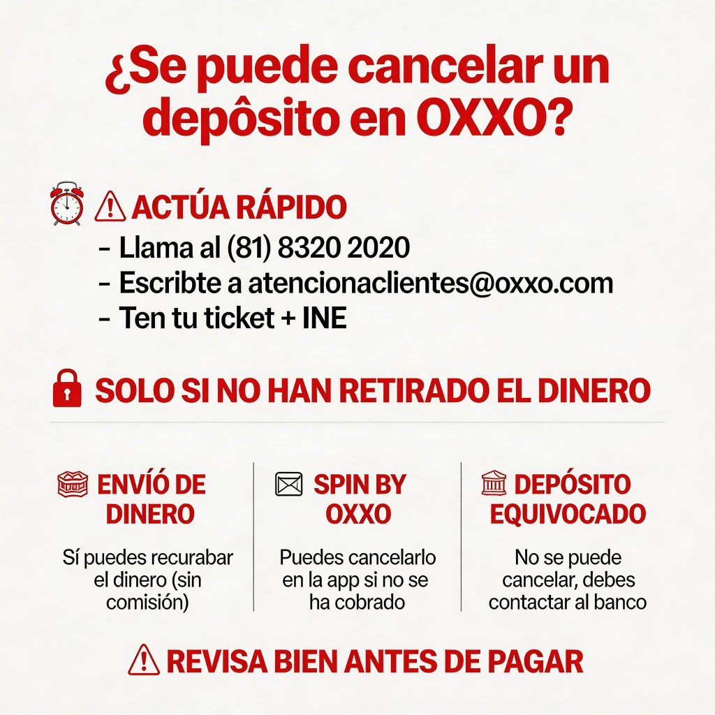 Hacer un depósito en OXXO es de las cosas más rápidas y prácticas en México: pones efectivo, das una referencia y listo. El problema empieza cuando te das cuenta que escribiste mal el número de cuenta, depositaste a la cuenta equivocada o el monto fue mayor al que querías. La pregunta inmediata es: ¿se puede cancelar un depósito en OXXO?