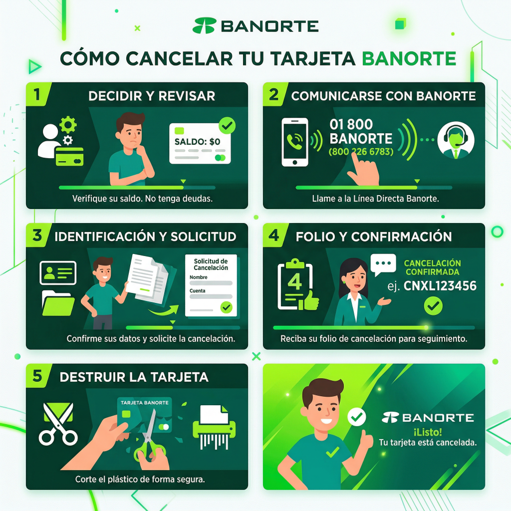Cancelar una tarjeta Banorte es un trámite gratuito y relativamente rápido, pero hay varias cosas que deberías revisar antes de hacerlo para no perder beneficios ni afectar tu historial crediticio. En esta guía te explicamos los tres métodos disponibles, los requisitos, y sobre todo lo que nadie te dice: qué pasa con tus puntos Recompensa Total, tus compras a meses sin intereses y tu score en el Buró de Crédito.